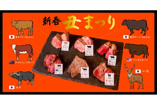 新春限定フェアは、2021年の干支「丑」をテーマに、水牛、東京ビーフ(黒毛和牛)、あかうし(あか毛和牛)、アンガスビーフ、グラスフェッドビーフ、エゾシカを使用した企画とのことです。