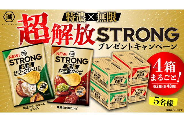 今回の発売にあわせて、抽選で5名様に当商品を4箱(計48袋)まるごとプレゼントする「湖池屋STRONG ポテトチップス 特濃✕無限 超解放STRONGプレゼントキャンペーン」も、2021年4月14日(水)から開催中です。