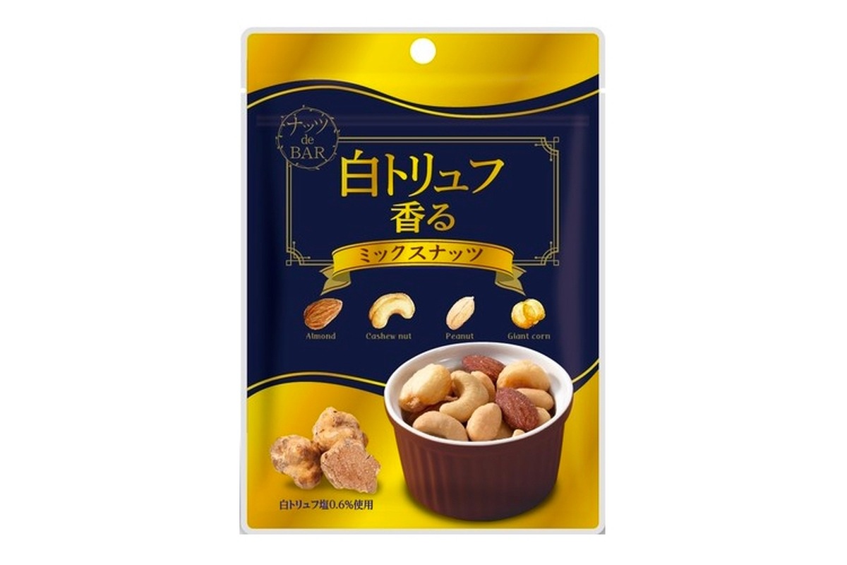 お酒と相性の良い白トリュフの豊かな香りと、4種類のミックスナッツの食感を楽しめる1袋だという「白トリュフ香るミックスナッツ」。ビールやワインなどと一緒に味わってみるのはいかがでしょうか?