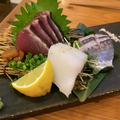 2品目は「刺し盛り」を注文。5点盛りまで可能ですが、今回はカツオ・アジ・イカの3点盛り。今日仕入れた店主オススメのどんちっちアジは脂がとてものっていて、食べた瞬間に旨味が口に広がります。もちろんカツオとイカも文句なしに美味しく、日本酒がスイスイと。