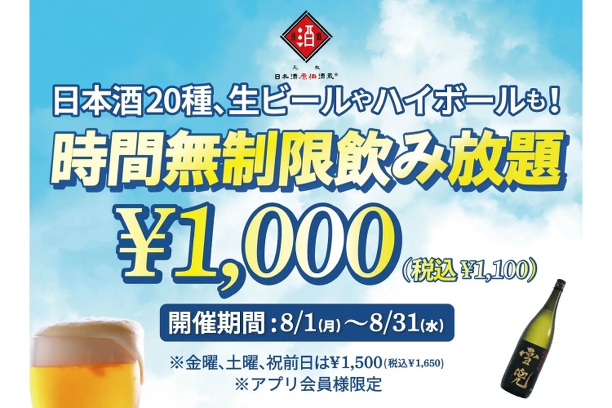首都圏を中心に展開している日本酒専門居酒屋「日本酒原価酒蔵」。同ブランドから、1,000円(税込1,100円)~で利用できる時間無制限飲み放題が開催になります。