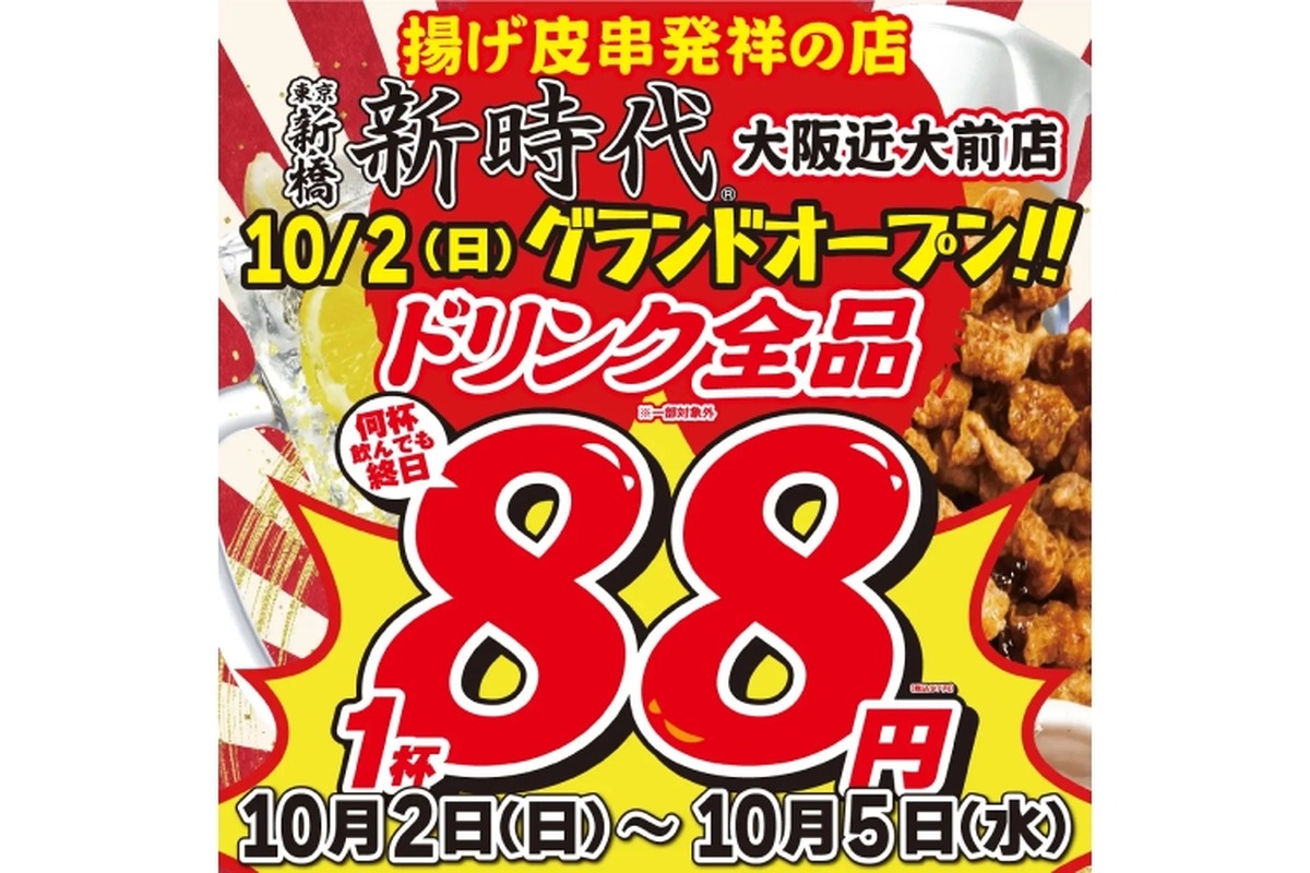 今回オープンする「新時代 大阪近大前店」では、ドリンク全品を88円で提供するオープンセールを開催するとのことなので、気になる方は是非、お得なうちに利用してみてください!