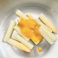 カットしたホワイトアスパラとに、酢味噌・レモン果汁を優しく絡める