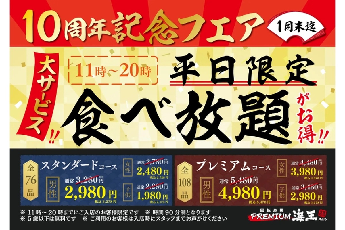 鮮度、食感、海の香りを楽しめる厳選した新鮮な魚を店内で捌き、卸立て・握りたての寿司を提供しているという「回転寿司プレミアム海王」。同店から、平日限定食べ放題の各コースをお得に楽しめる「10周年祭」が開催になります。