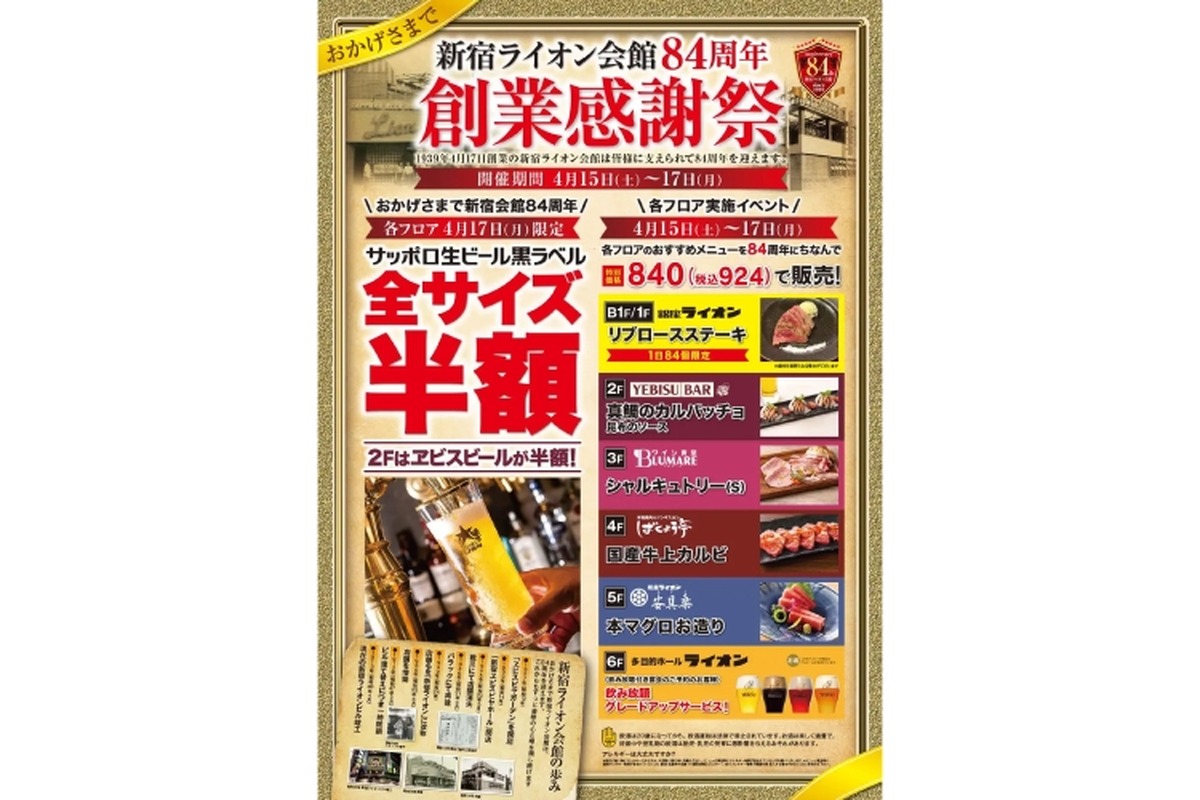 目玉企画は、「サッポロ生ビール黒ラベル」の全サイズ半額サービス。記念日当日の4月17日(月)に、B1Fから6Fの全フロアがサッポロライオン運営の飲食店となっているビル「新宿ライオン会館」の各フロアで実施されます(2FのYEBISU BAR(ヱビスバー)ではヱビスビールが半額)。