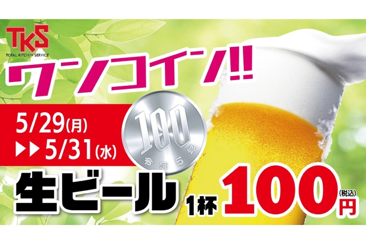 ティーケーエスから、「生ビールワンコイン」が、2023年5月29日(月)~5月31日(水)の期間寿司屋や居酒屋などの直営14店舗で開催になります。