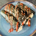 もう一本も巻きとカットが終わったら皿に乗せ、上からシラチャーソースと白ごまを振りかけて出来上がり。