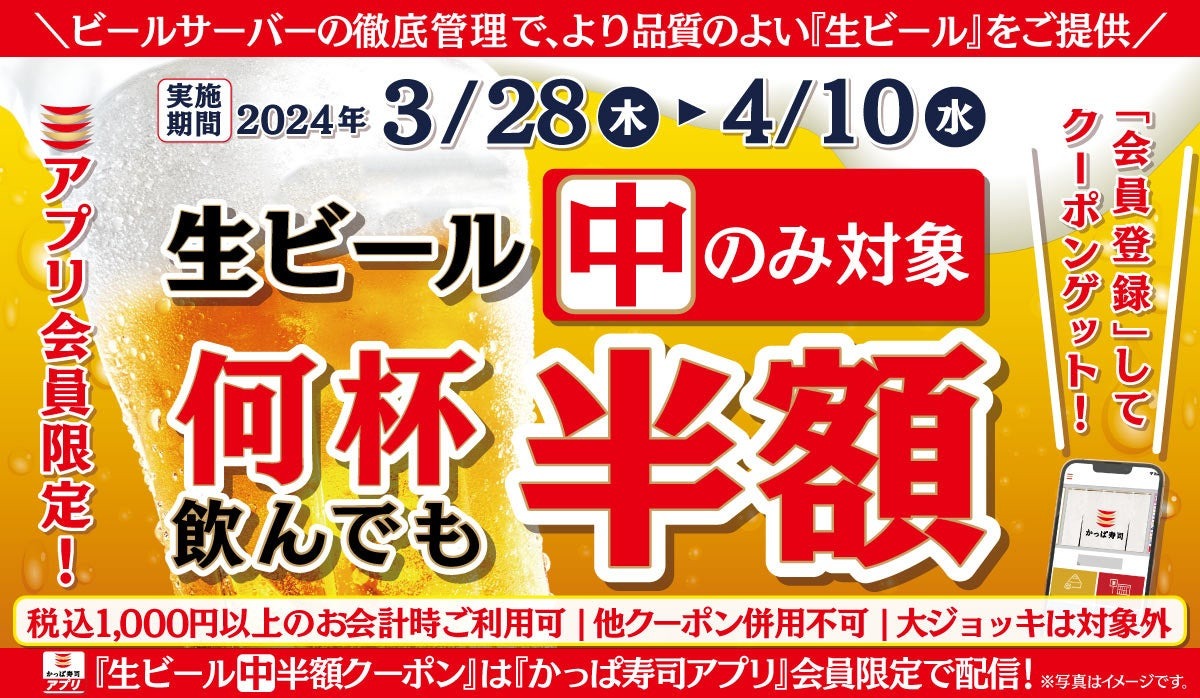 全国の「かっぱ寿司」にて、2024年3月28日から4月10日までの期間、「生ビール(中)半額キャンペーン」が開催になります。