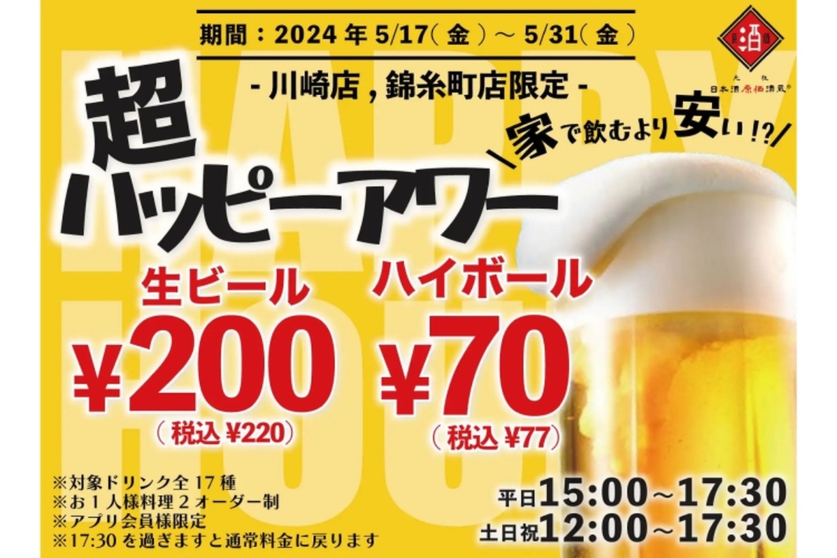 日本酒原価酒蔵から、「超ハッピーアワー」が、2024年5月17日(金)~5月31日(金)の期間、「日本酒原価酒蔵 川崎店」「日本酒原価酒蔵 錦糸町店」で開催になります。
