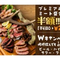 期間限定で、「めり乃」おすすめの食べ比べができる「プレミアム5ミート盛合わせ(ラム肩ロース、牛ザブトン、合鴨、黒豚ロース、鹿もも肉)」通常4,180円を半額の2,090円で提供、「生ビール・ハイボール・サワー等」を何杯でも1杯99円で提供するそう。