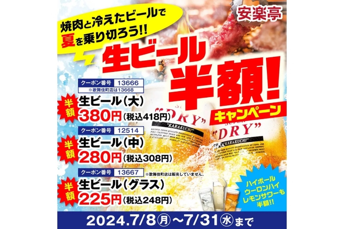 焼肉レストラン安楽亭から、「生ビール半額!キャンペーン」が、2024年7月8日(月)~7月31日(水)にて開催になります。