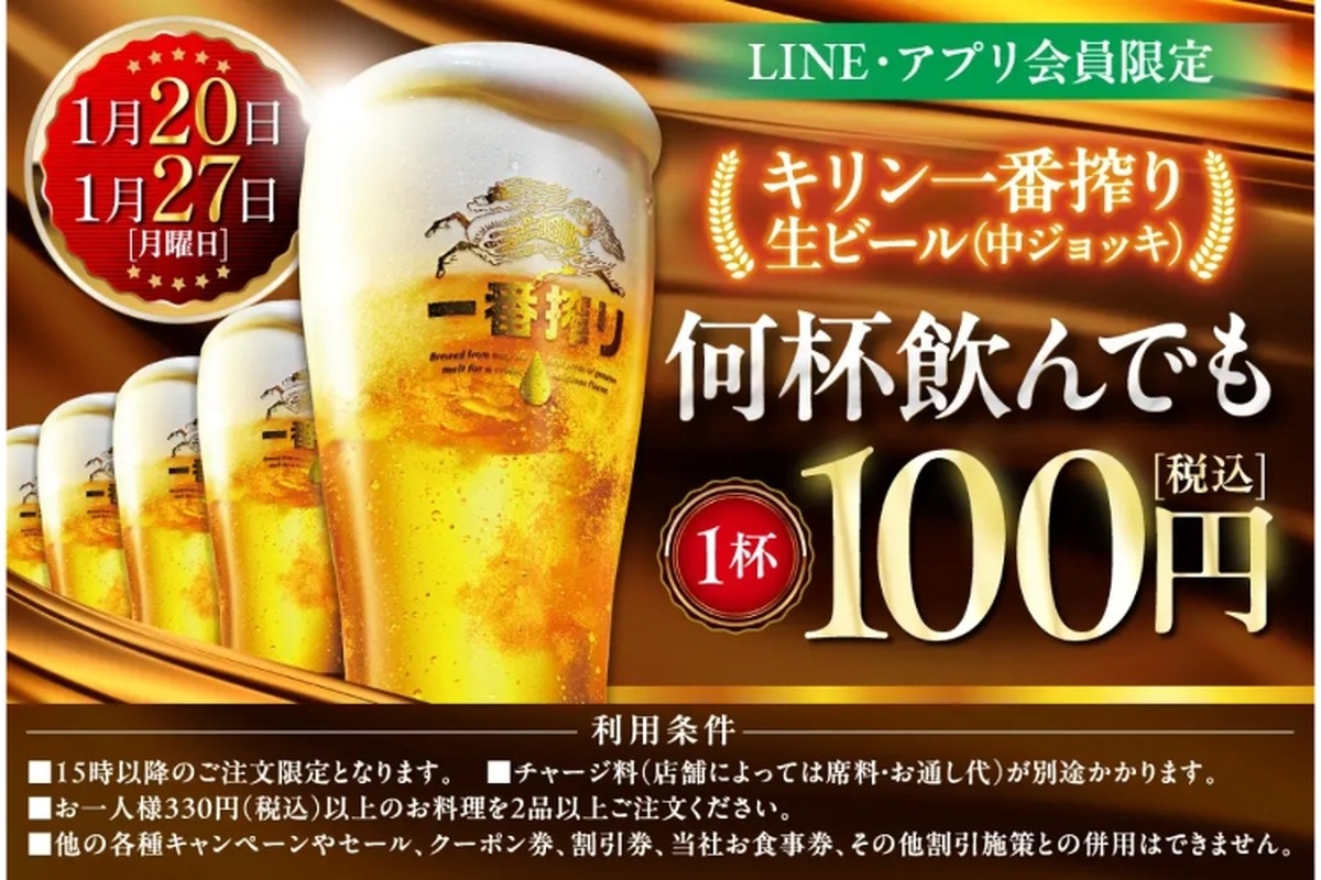 モンテローザから、「キリン一番搾り生ビール何杯飲んでも1杯100円セール」が、2025年1月20日(月)・1月27日(月)にて、「魚民」「目利きの銀次」「山内農場」「千年の宴」などの全国のモンテローザ対象店舗で実施になります。