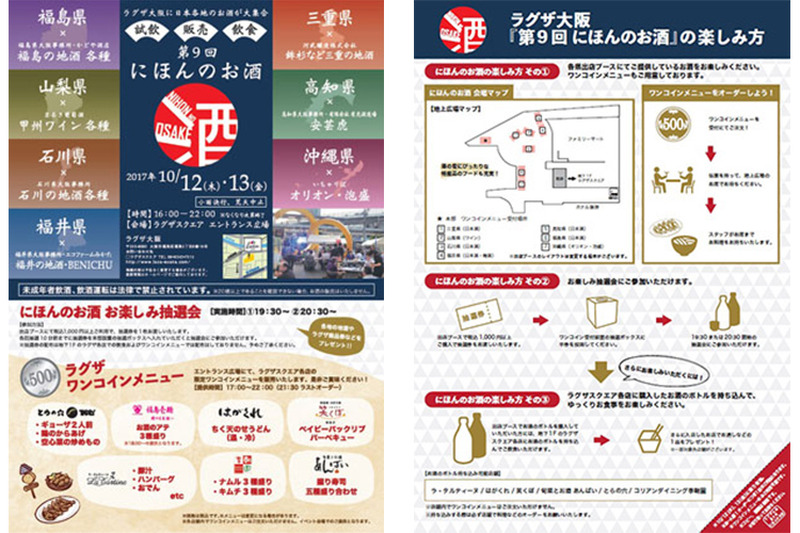 大阪の商業施設ラグザ大阪にて10/12(木)、10/13(金)に「第9回 にほんのお酒」が開催されます。 試飲しながらお気に入りのお酒を見つけることができるイベント。お酒はボトル販売のほか1杯から販売してお …