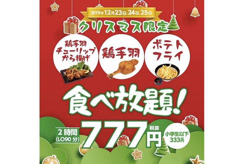 株式会社串カツ田中ホールディングスは、鶏手羽チューリップから揚げ・鶏手羽串・ポテトフライ2時間食べ放題777円キャンペーン「串カツ田中のクリスマス企画」を開催します。期間は2019年12月23日(月)~12月25日(水) …