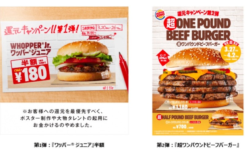 バーガーキング® から、「還元キャンペーン第1弾」が、2020年3月20日(金)~3月26日(木)にて開催になります。また「還元キャンペーン第2弾」が、2020年3月27日(金)~4月2日(木)にて開催になります。 「還 …