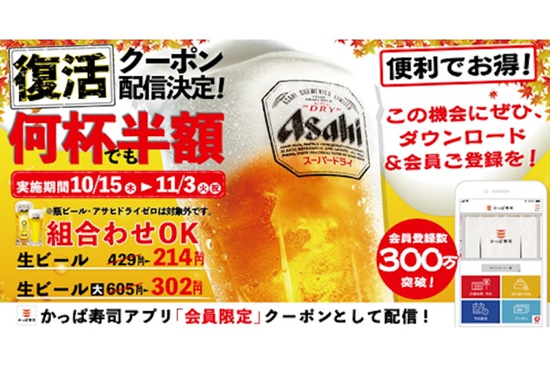 かっぱ寿司から、2020年10月15日(木)~11月3日(火・祝)の期間中、かっぱ寿司全店で使用できる「生ビール半額キャンペーン」クーポンがかっぱ寿司公式アプリ会員に配信されます。 「生ビール半額キャンペーン」は、かっぱ …