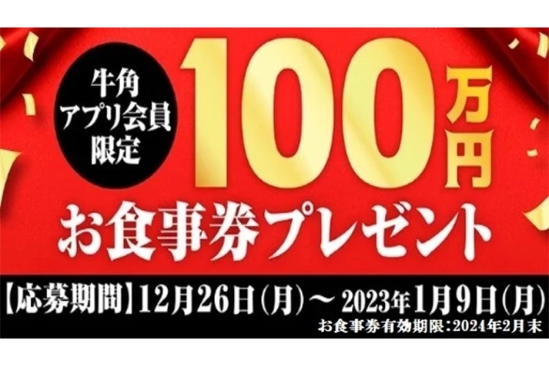 牛角から、100万円分の食事券が当たるアプリキャンペーンが、2022年12月26日(月)~2023年1月9日(月)にて開催になります。