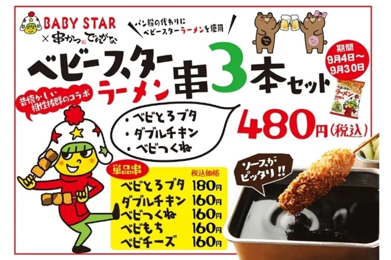 おやつカンパニーから、ベビースターを衣にしたコラボ串メニューが、2023年9月4日(月)より、居酒屋「串かつ でんがな」と、ネオ居酒屋「串かつとお酒 でんがな」にて、復刻展開されています。