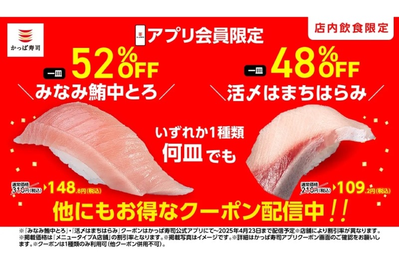 かっぱ寿司から、アプリ会員限定の「お得なクーポン」が、2025年4月17日(木)~4月23日(水)にて、かっぱ寿司公式アプリ会員向けに延長&追加配信になります。